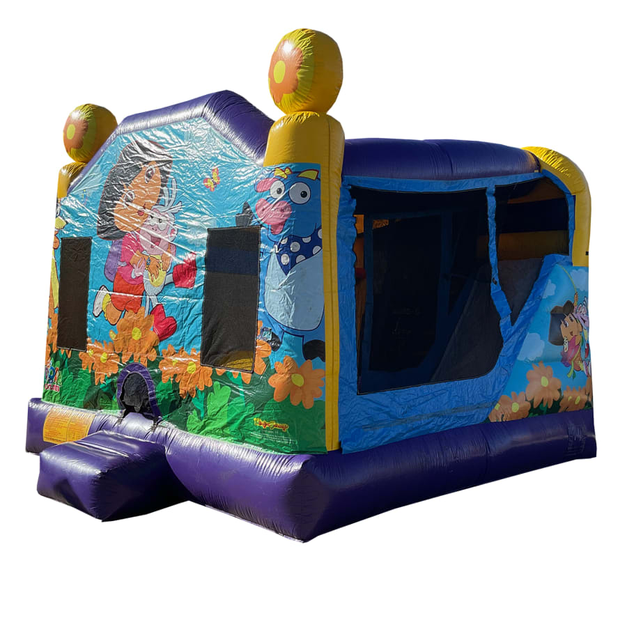 Bring joy and excitement to your child's party with our 5 in 1 Dora Combo W/ Slide Inside! This inflatable combo is perfect for fans of the adventurous cartoon character Dora. Let your kids dive into an imaginative world where they can explore with Dora and Mapa and race to stop Swiper from swiping! πŸ—ΊοΈπŸΎ