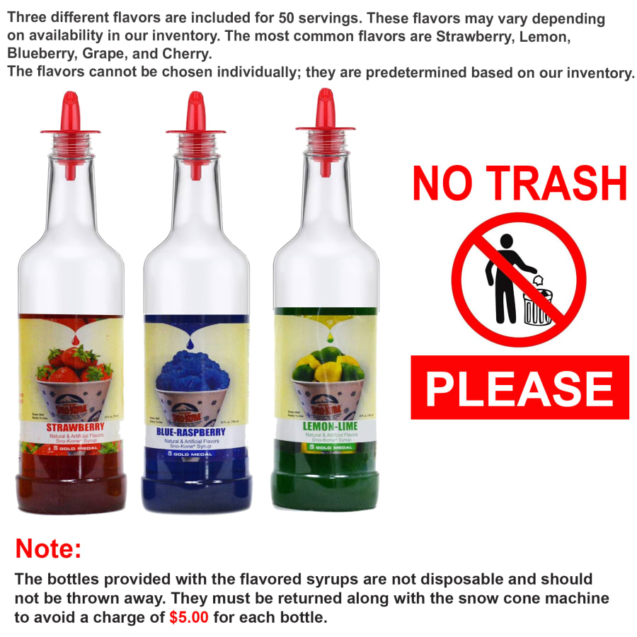 The bottles provided with the flavored syrups are not disposable and must not be thrown away. All syrup bottles must be returned with the snow cone machine. A $5.00 fee per bottle will apply for any bottles not returned.