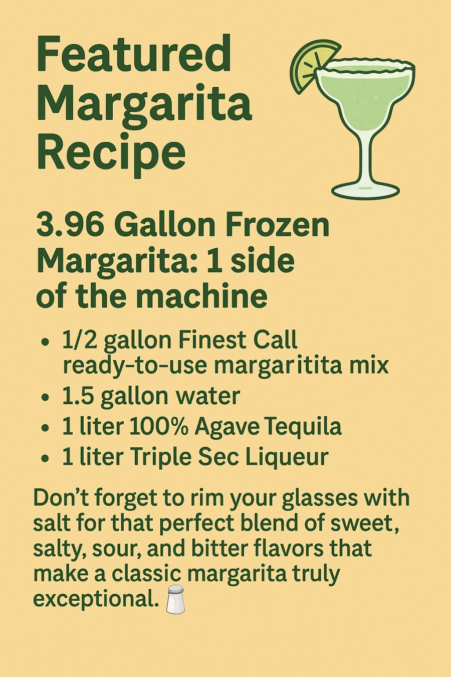 ๐น Rental includes Finest Call 1 Gallon Ready-to-Use Margarita Mix. You could always add extra if need be.