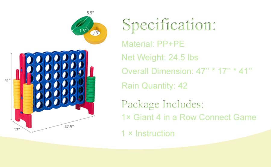 - Perfect for All Ages: Whether it's kids, teens, or adults, Giant Connect 4 provides endless fun and brings out the competitive spirit in everyone.
